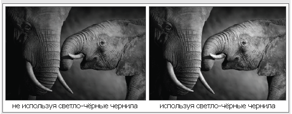 Светло-черные чернила (Lk) обеспечивают оптимальный баланс по серой шкале и позволяют добиться плавных градиентных переходов без видимого растра и нежелательных цветовых смещений (в область красного или зеленого) при печати черно-белых изображений, а также достичь естественной цветопередачи телесных оттенков.