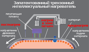 Трехзонный интеллектуальный нагреватель способствует сохранению идеального размера и формы капель чернил. При неоптимальной температуре материала, идеального размера и формы капли неправильно «прилипают» к материалу. Встроенный в плоттеры запатентованный трехзонный интеллектуальный нагреватель обеспечивает идеальное для высококачественной печати нагревание материала.