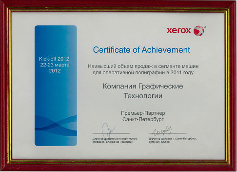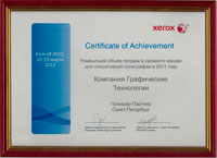 22-23 марта 2012 Сертификат XEROX за Наивысший объем продаж цифровых печатных машин в 2011 году