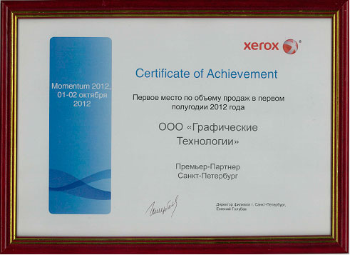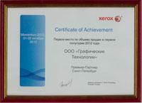 1-2 октября 2012 Сертификат XEROX за Первое место по объему продаж в первом полугодии 2012 года