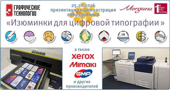 Под девизом «Инвестируя в успех!» компания «Графические технологии», надёжный поставщик решений для цифровых типографий приглашает 25 октября на презентацию и демонстрацию «изюминок» для современных типографий от ведущих производителей: Xerox, Mimaki, Morgana Systems и других.