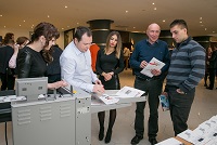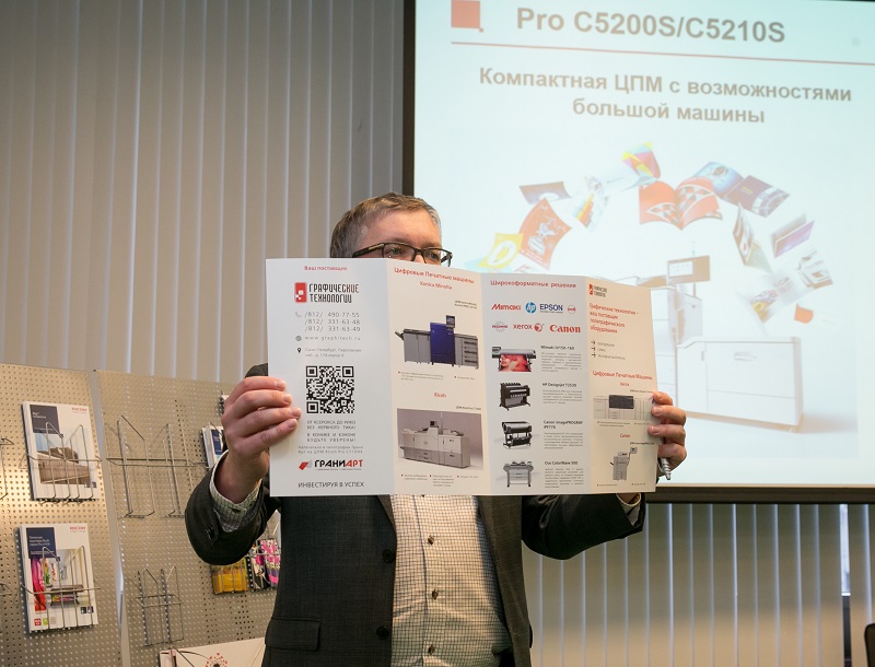 Презентация была очень «живой», затрагивающая «больные места» производства. На примере изготовления стандартных буклетов 2000 листов А4 формата с С-фальцовкой были предоставлены расчеты по времени на постпечатную обработку на ручном оборудовании, полуавтоматическом и полностью автоматическом. Разница составила от 30 мин на биговально-фальцевальные работы до 8-часовой смены. И далее выбор остается за типографией – могут ли они себе позволить потратить на один заказ целый день, или за полчаса сделать всю постпечатную работу.