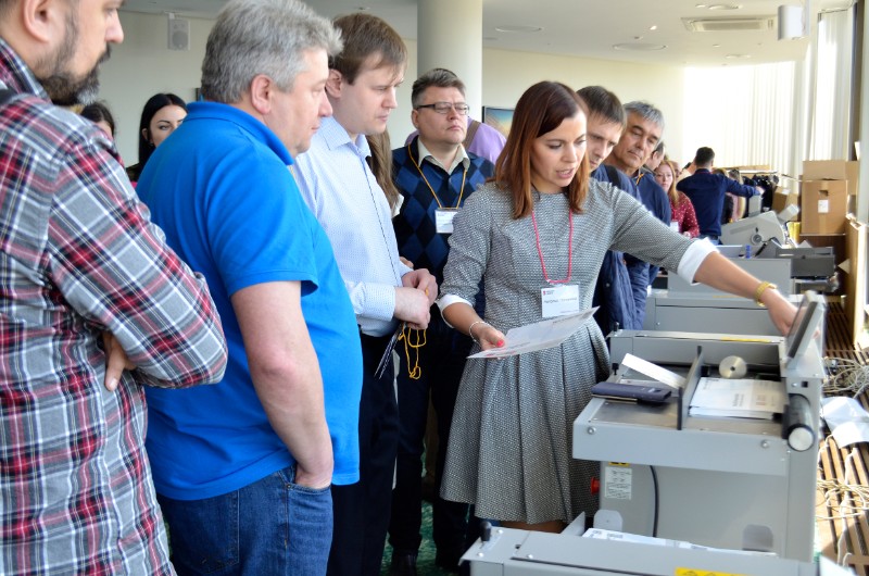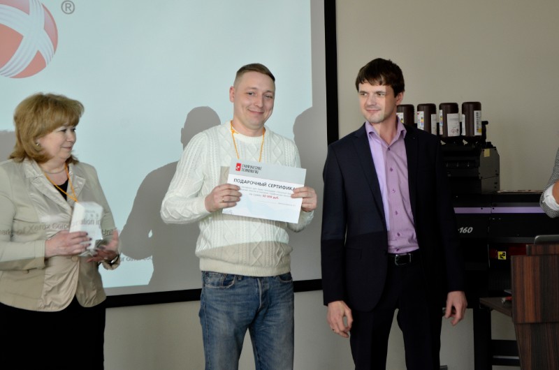 После практической части гости ненадолго вернулись к теории: ознакомились с новинками бумаги от компании Xerox, понаблюдали за работой режущего плоттера: Cutting PRO FCX 2000-60. А также были награждены победители конкурса по бумаге «Голодные игры», который организовали «Графические технологии» совместно с Xerox. Главным условием конкурса являлась закупка бумаги Xerox. Победитель определялся по двум показателям: - объем закупок бумаги (в рублях) в период с 1 декабря 2017 по 28 февраля 2018; -динамика роста за аналогичный период прошлого года. Компании, показавшие максимальный результат по двум критериям, были определены победителями и награждены: