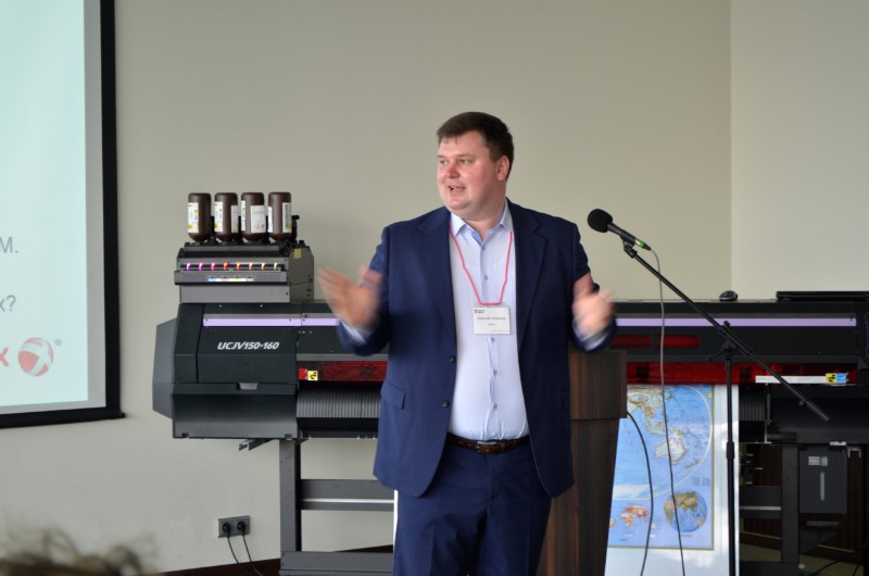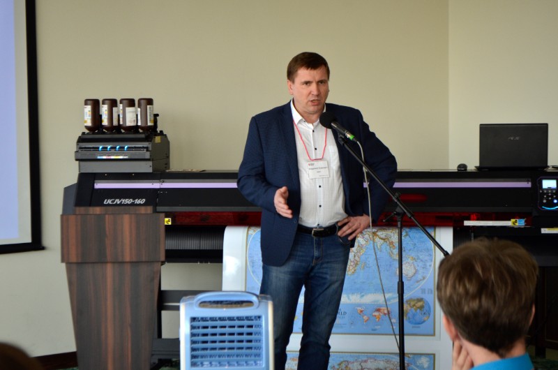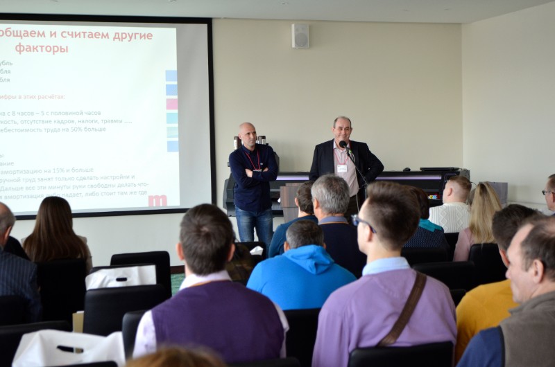 В общей сложности в конференц-зале собралось около 50 полиграфистов. Семинар открыла руководитель отдела продаж компании "Графические технологии" Ольга Камченко, рассказав, что компания все теснее сотрудничает с полиграфистами, и планирует проводить такие встречи чаще. После вступительного слова, к микрофону был приглашен президент Издательско-Полиграфической ассоциации высших учебных заведений, Александр Иванов. Свой доклад «о насущном» - то есть о вечной проблеме типографий - автоматизировать процессы или нет, Александр Васильевич резюмировал, что несмотря на автоматизацию, проблема остается в сервисе и качестве обслуживания.
